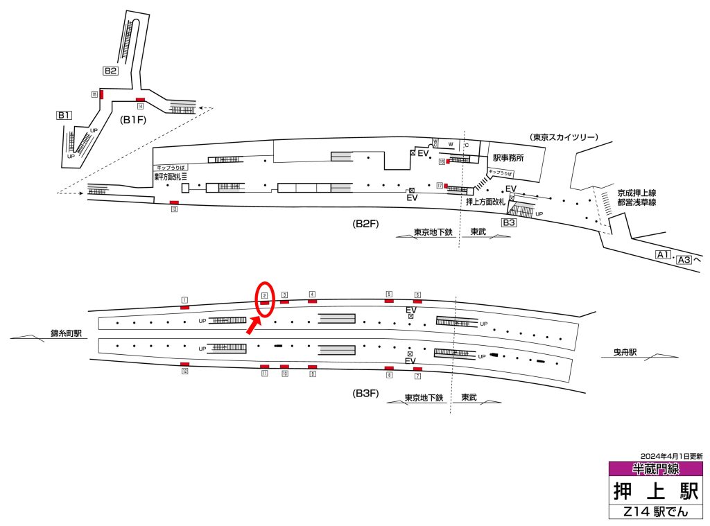 東京メトロ押上駅は一日の乗降客数が147,642人、半蔵門線が発着する駅です。