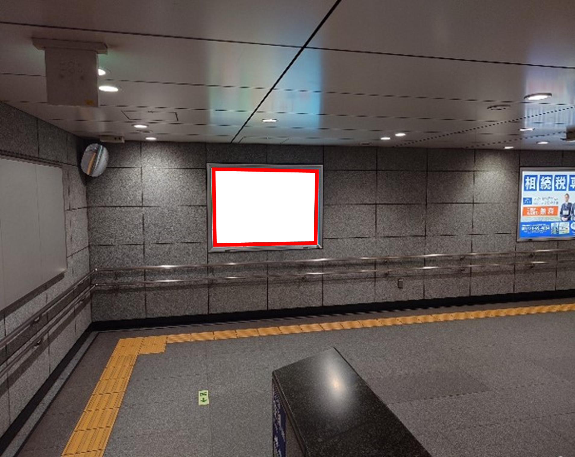 ■地下出口①方面の出口通路階段踊場の壁面にあり多くの方にご覧いただける大変視認性の高い看板です。