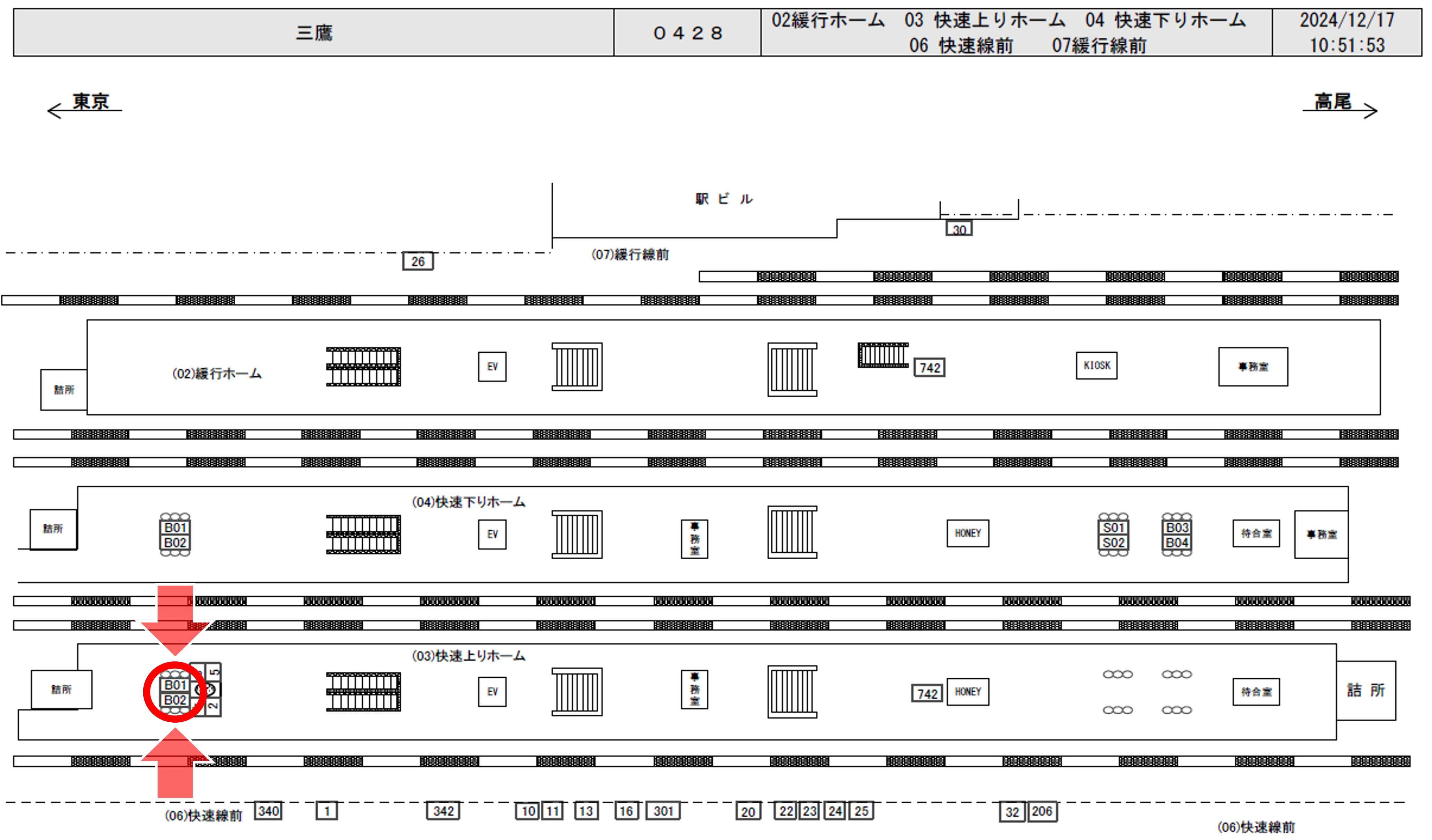JR三鷹駅は一日の乗降客数が178,590人、中央線、中央・総武線(各駅停車)が発着する駅です。