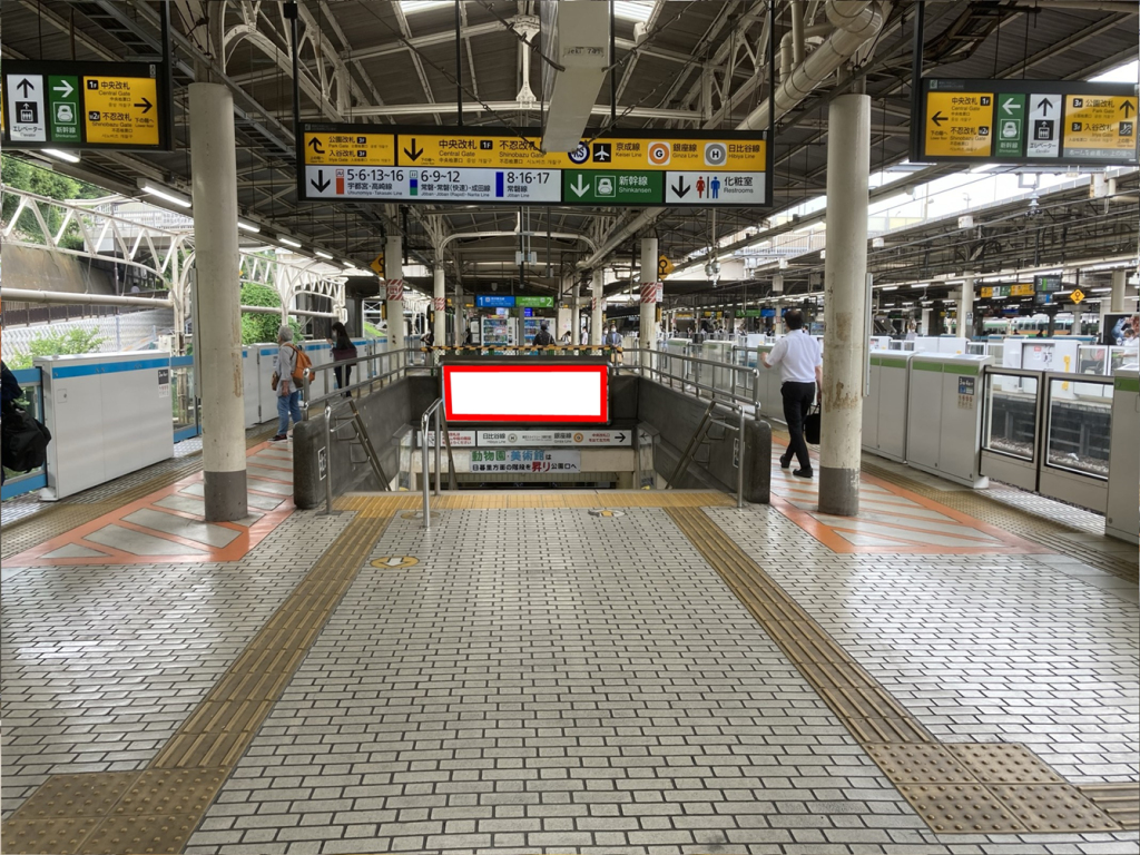 ■ご利用人数の多い中央改札口に近いホーム階段の目立つ場所に設置されている非常に注目度が高い看板です。