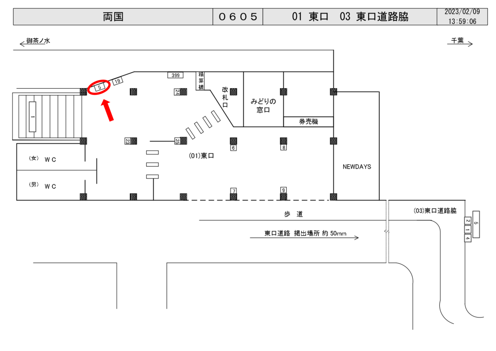 JR両国駅東口改札内通路、改札前の壁面に設置されている看板です。