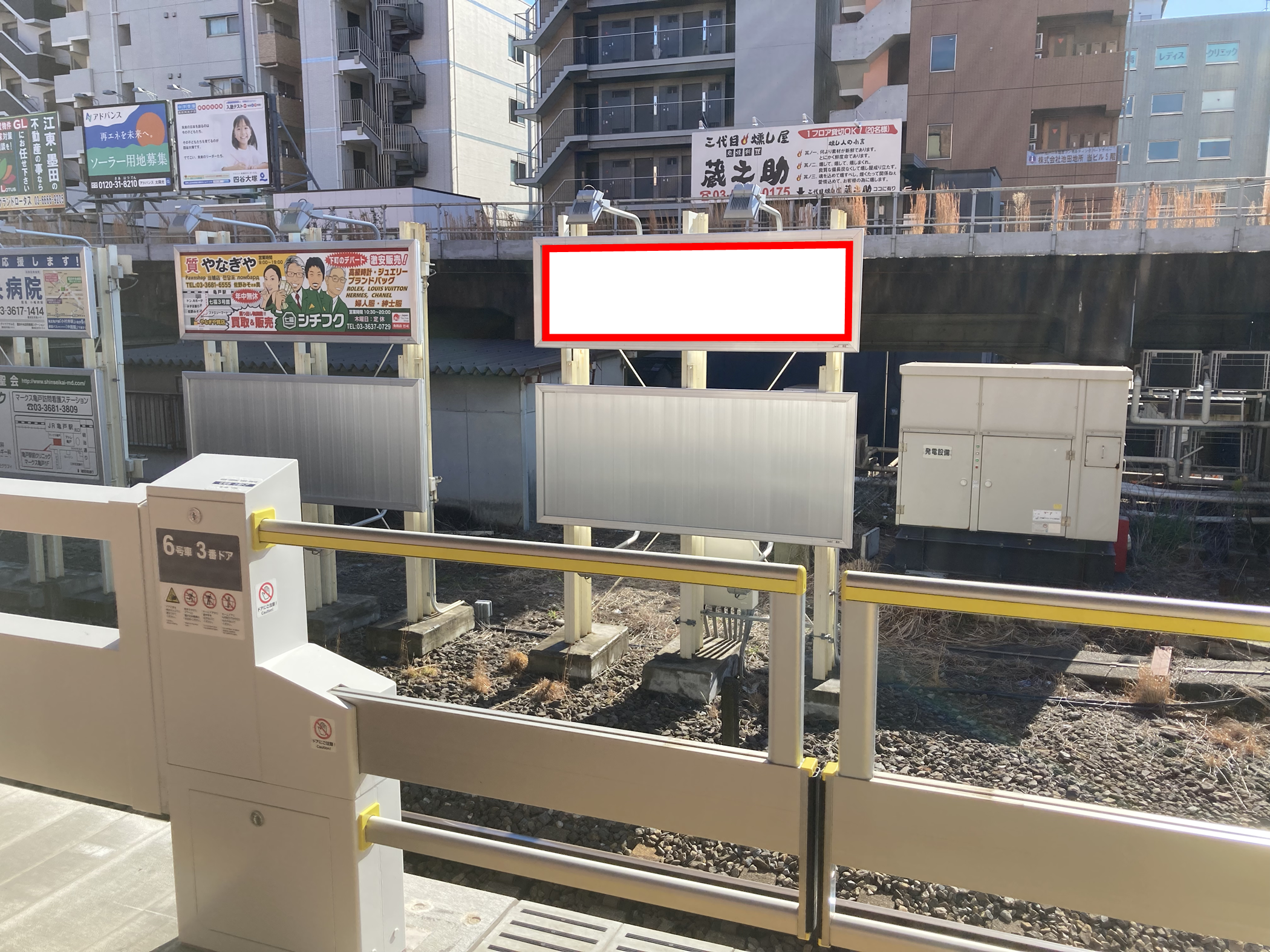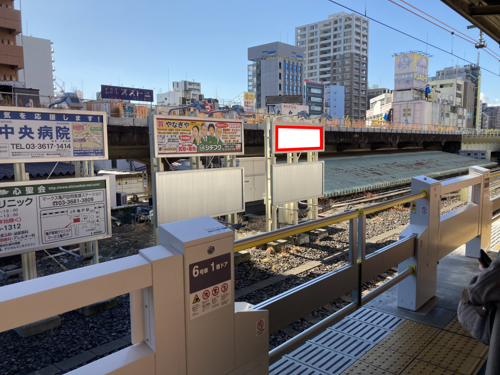 JR亀戸駅の総武線(各駅停車)の中野方面ホーム前に設置された駅看板です。