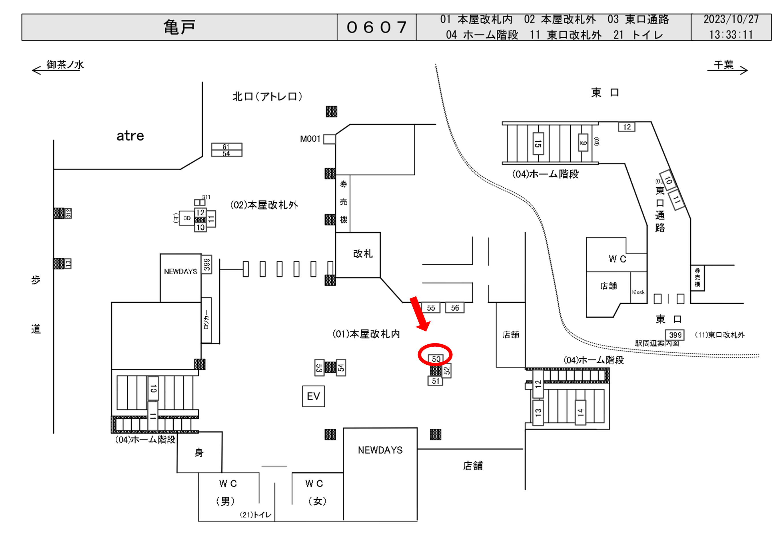 JR亀戸駅の改札内通路柱面に設置された看板です。