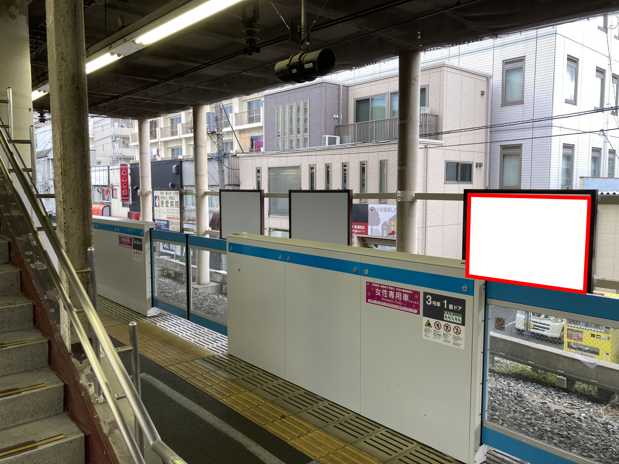 JR南浦和駅の京浜東北線(赤羽・上野方面)ホーム前のホーム階段横に設置された電飾看板です。