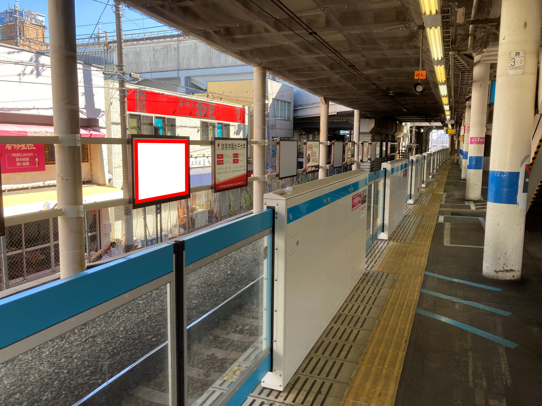 ■ホーム階段横にありホームで電車を待っているお客様、下車されて改札へ向かうお客様がご覧になる視認性の高い看板です。