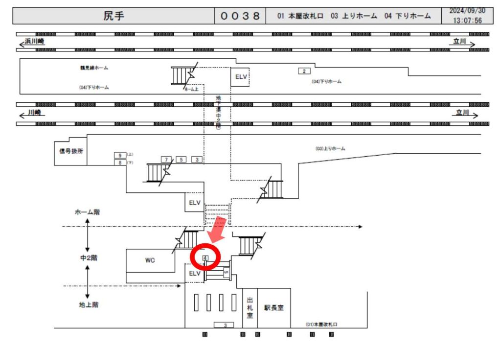 JR南武線 尻手駅、改札内の階段・エレベーターそばに設置されている看板です。