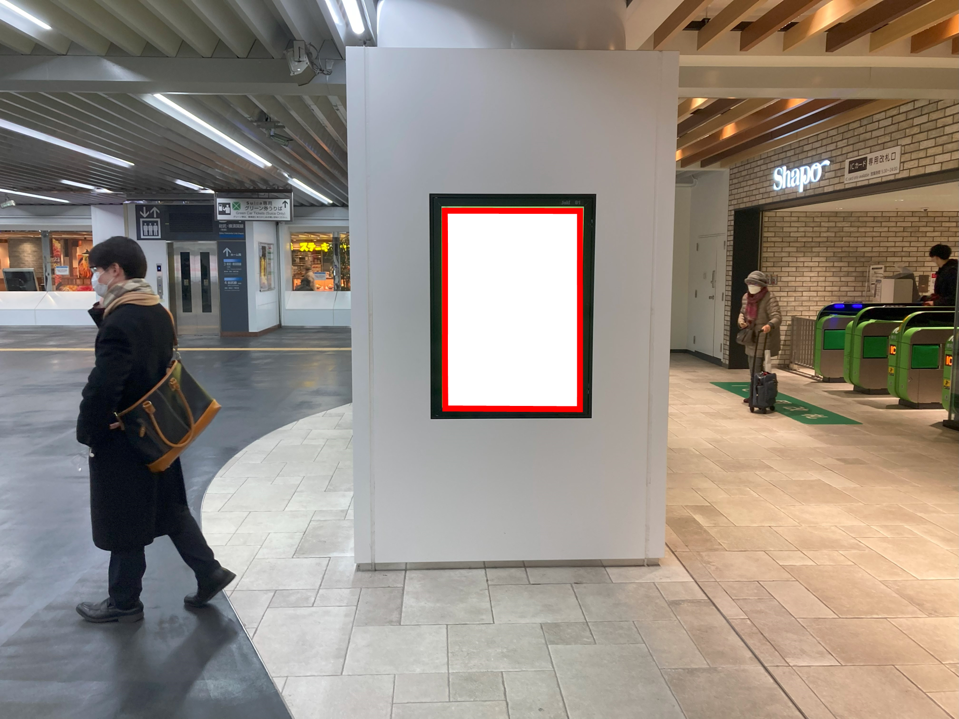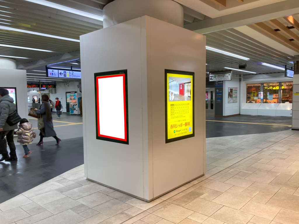 JR市川駅の改札内、ショッピングセンター口改札前の柱面に設置された看板です。
