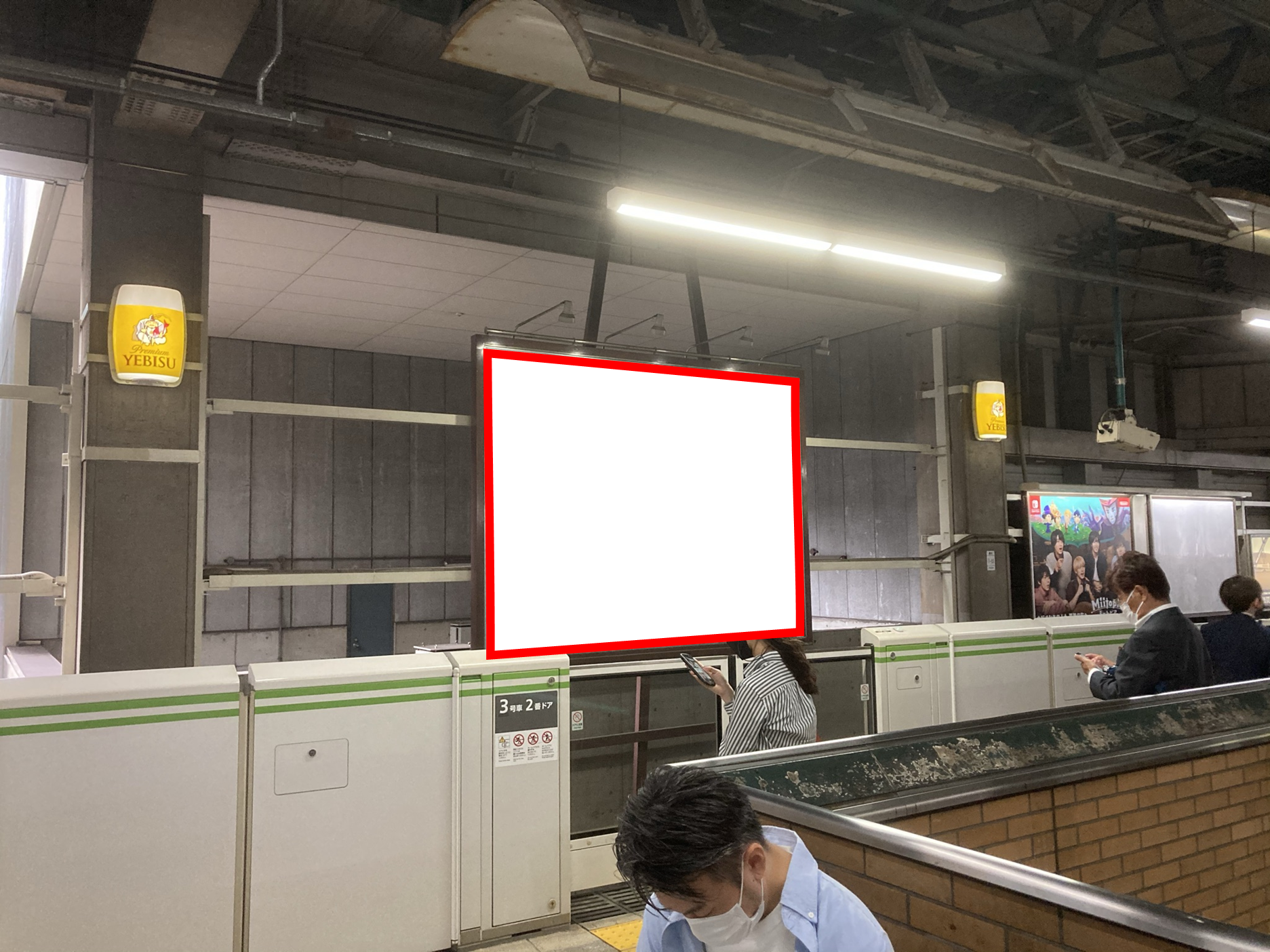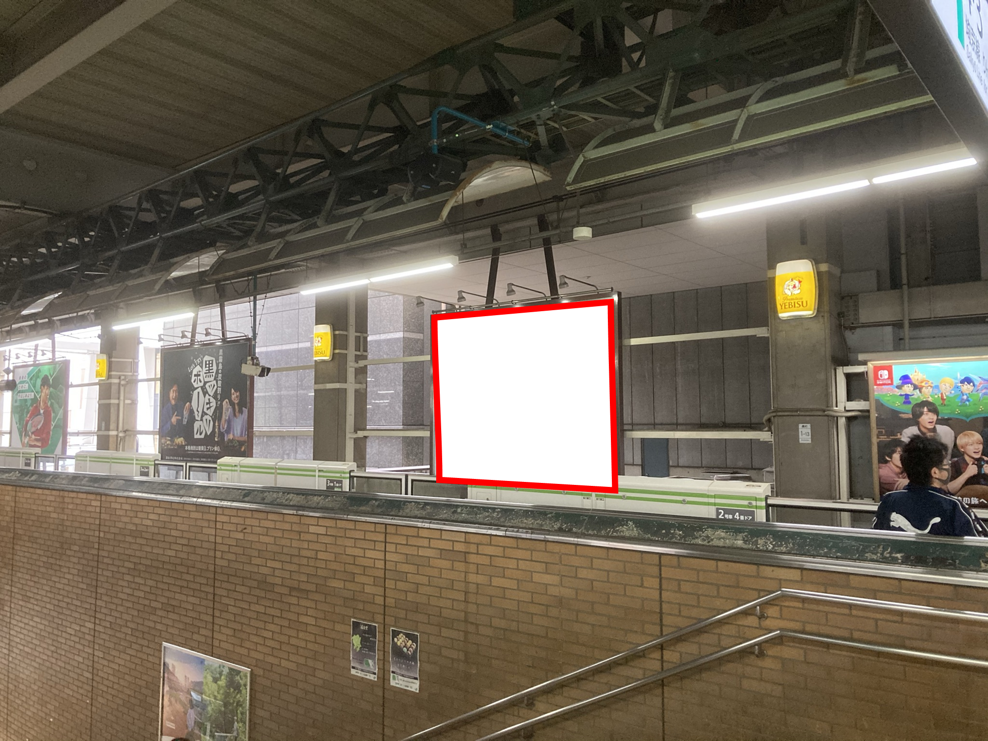 JR恵比寿駅の山手線(渋谷・新宿・池袋方面)ホーム前、1F西口改札方面ホーム階段横に設置された上部照明付きボード看板です。