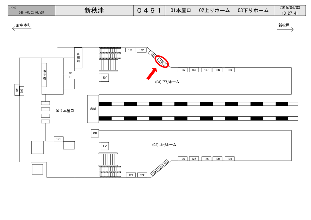 JR新秋津駅(武蔵野線)、下りホーム(南浦和・新松戸・西船橋方面)のホーム階段付近に設置されている看板です。