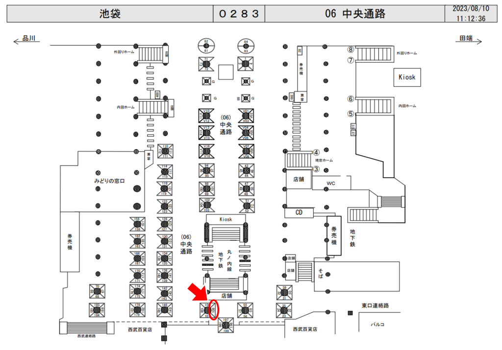 JR池袋駅の中央改札外、東京メトロ丸の内線改札付近の柱面に設置された駅看板です。
