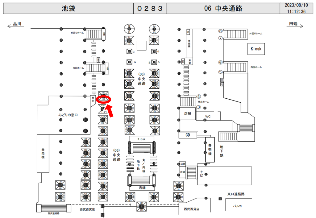 JR池袋駅の改札外、中央改札付近の柱面に設置された駅看板です。