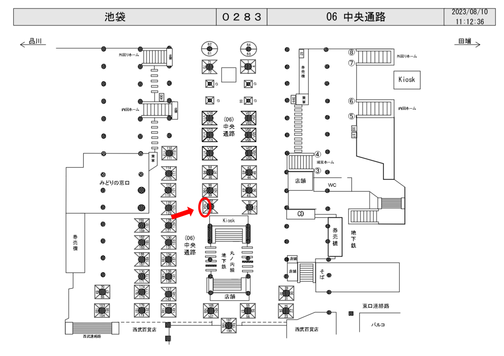 JR池袋駅の中央改札外、東京メトロ丸の内線改札付近の柱面に設置された駅看板です。