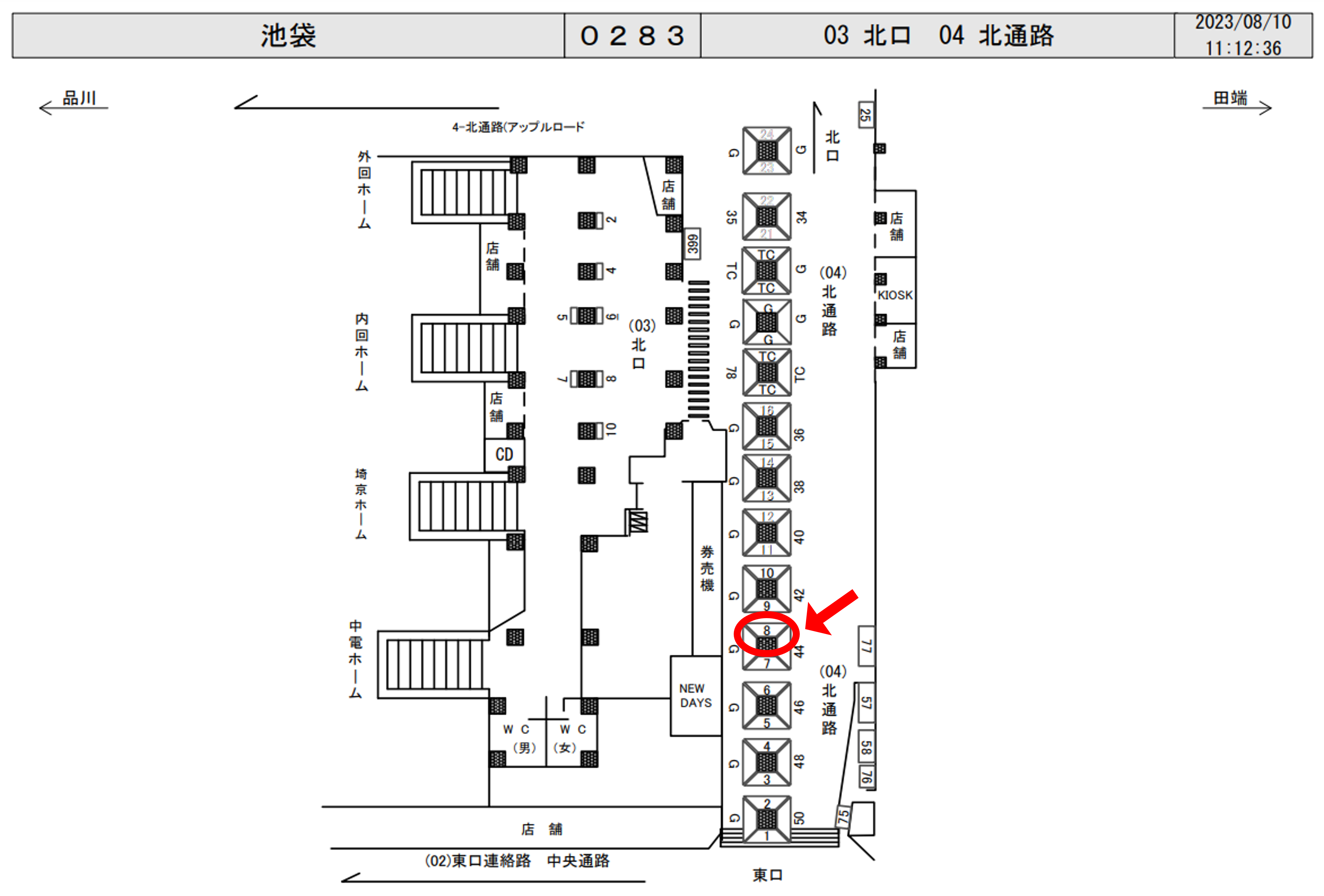 JR池袋駅の改札外、北通路のNew Days付近の東口寄り柱面に設置された駅看板です。