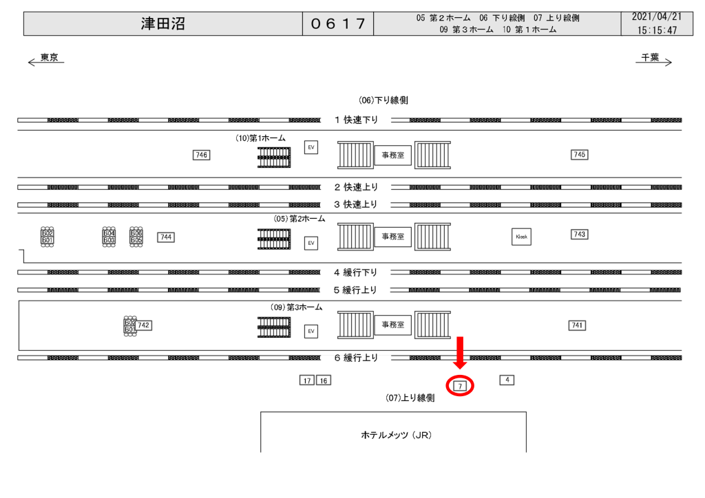 JR津田沼駅は一日の乗降客数が202,654人、総武線(快速)、総武線(各駅停車)が発着する駅です。
