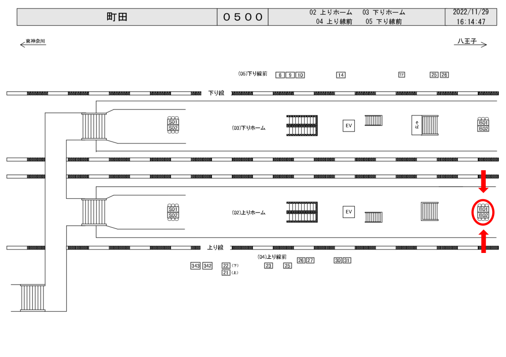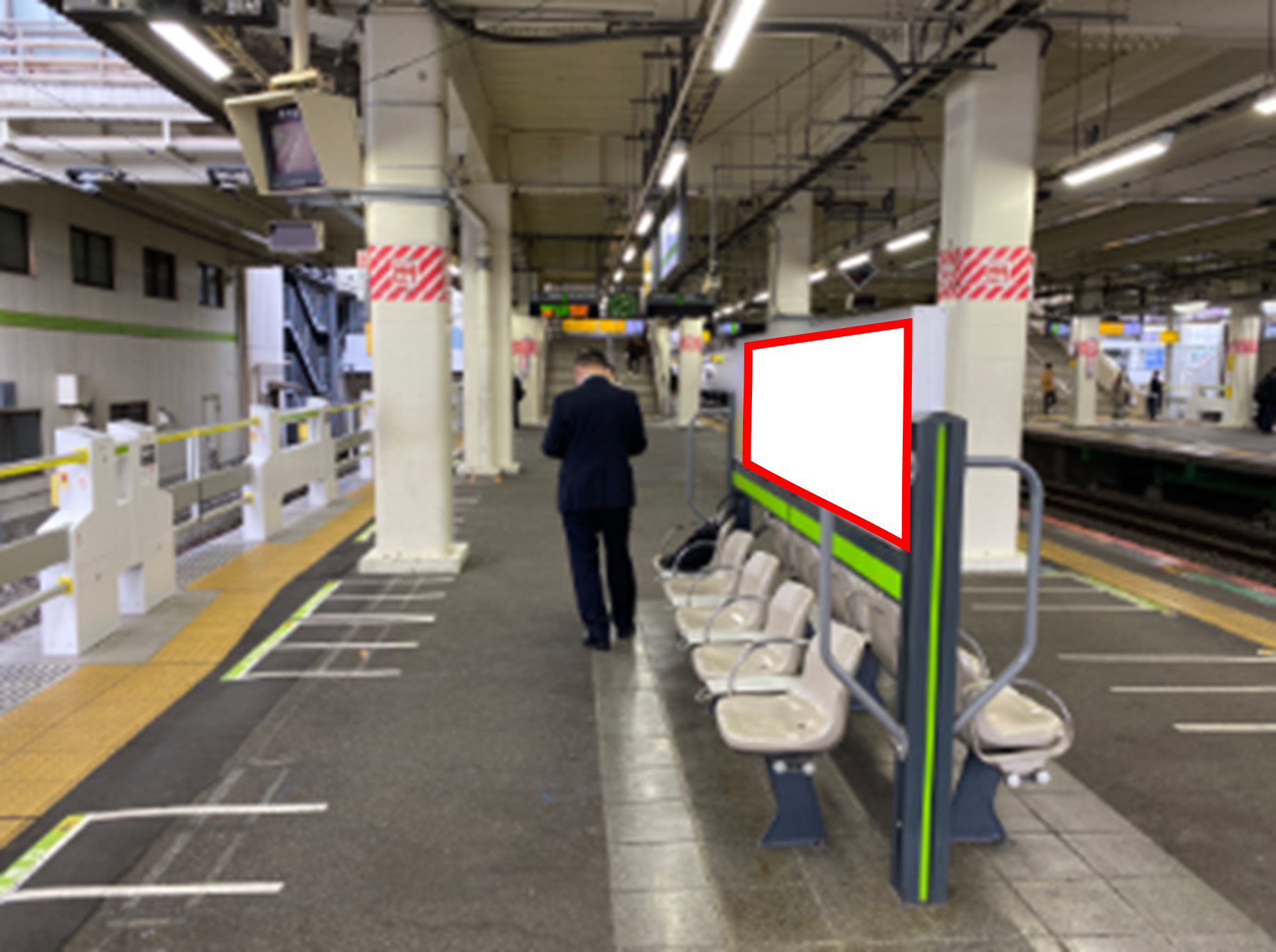 JR町田駅の上りホーム(新横浜・東神奈川・桜木町方面)、ホーム階段付近に設置されたベンチ看板です。