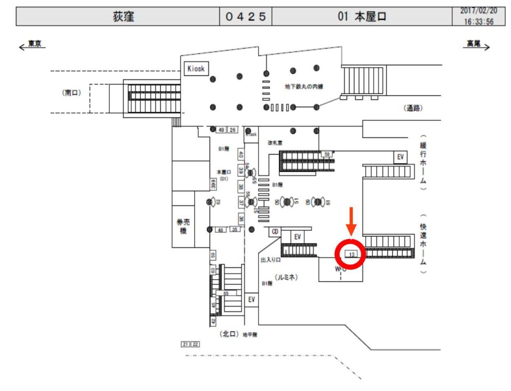 JR荻窪駅の中央線(中野・新宿・東京方面)快速ホーム前、ホームエレベーター付近に設置された看板です。
