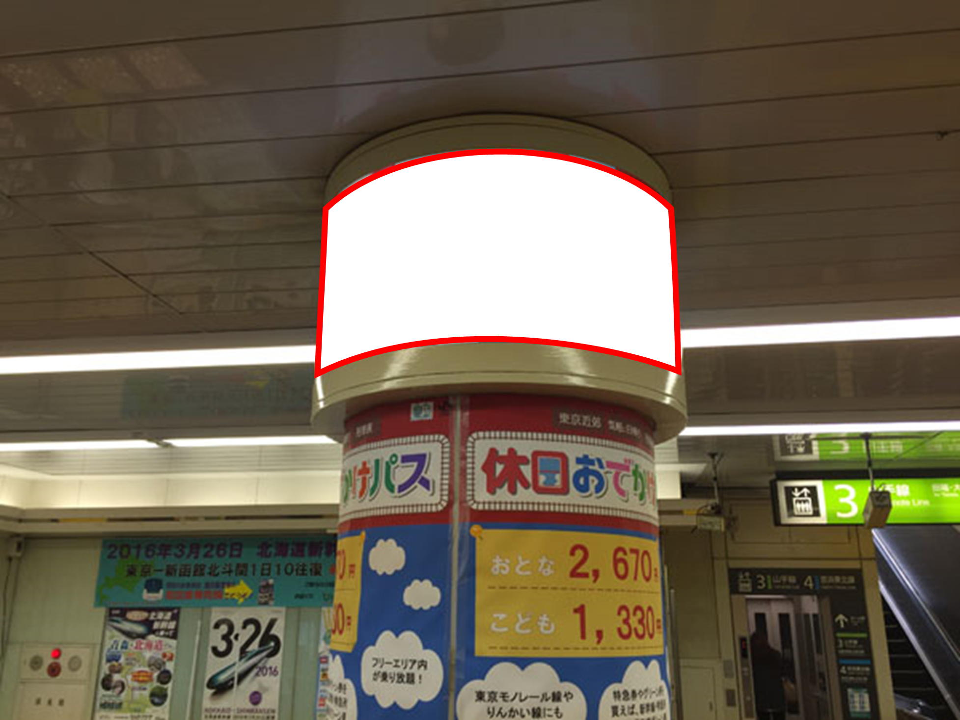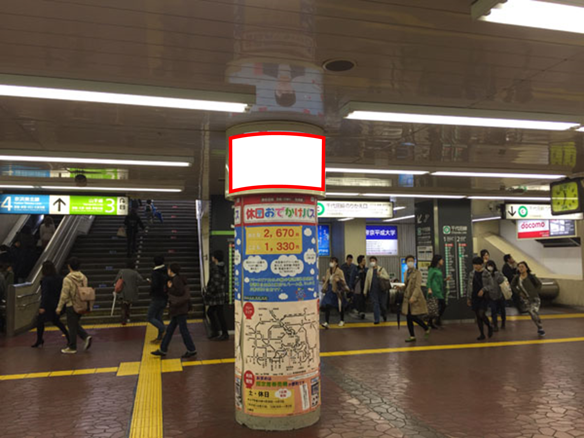■踊り場中心にある円形柱上部に設置され乗降される多くの方があらゆる方向からもご覧になる大変視認性の高い看板です。