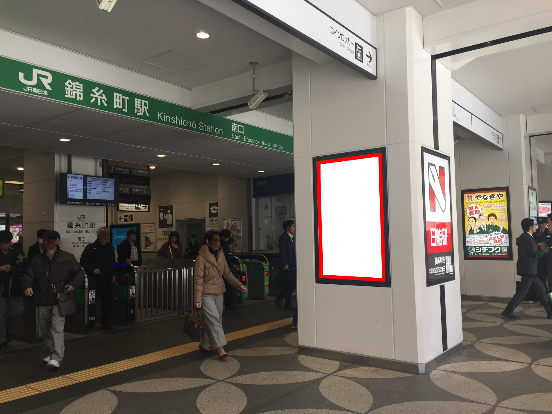■JR錦糸町駅の南口改札前にある柱に設置されている大変視認性の高い看板です。