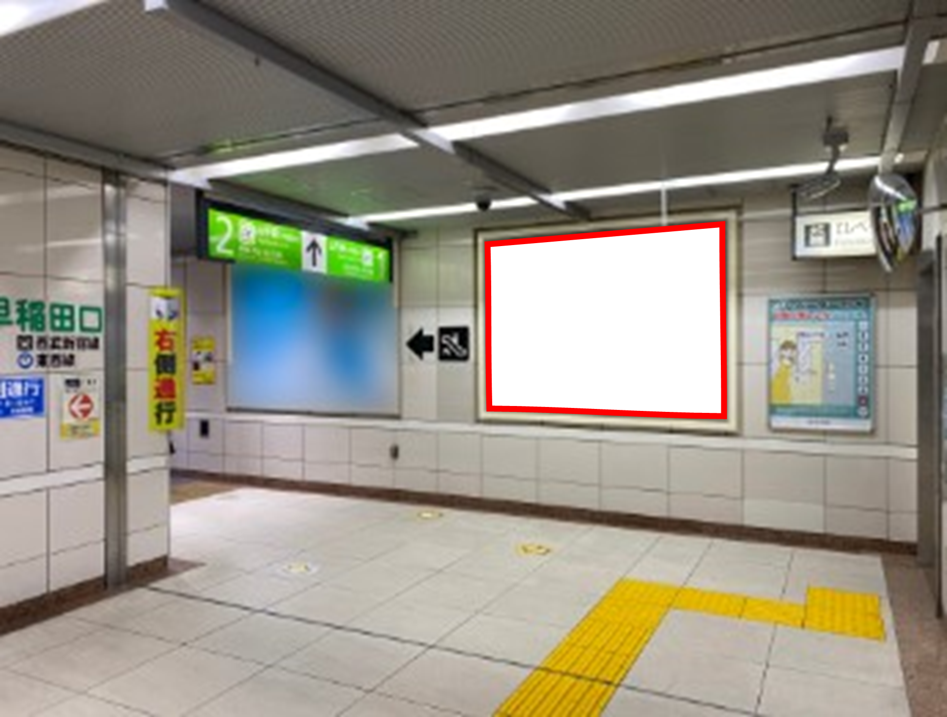 JR高田馬場駅のホームエレベーター前、ホームエスカレータ付近の壁面に設置された看板です。